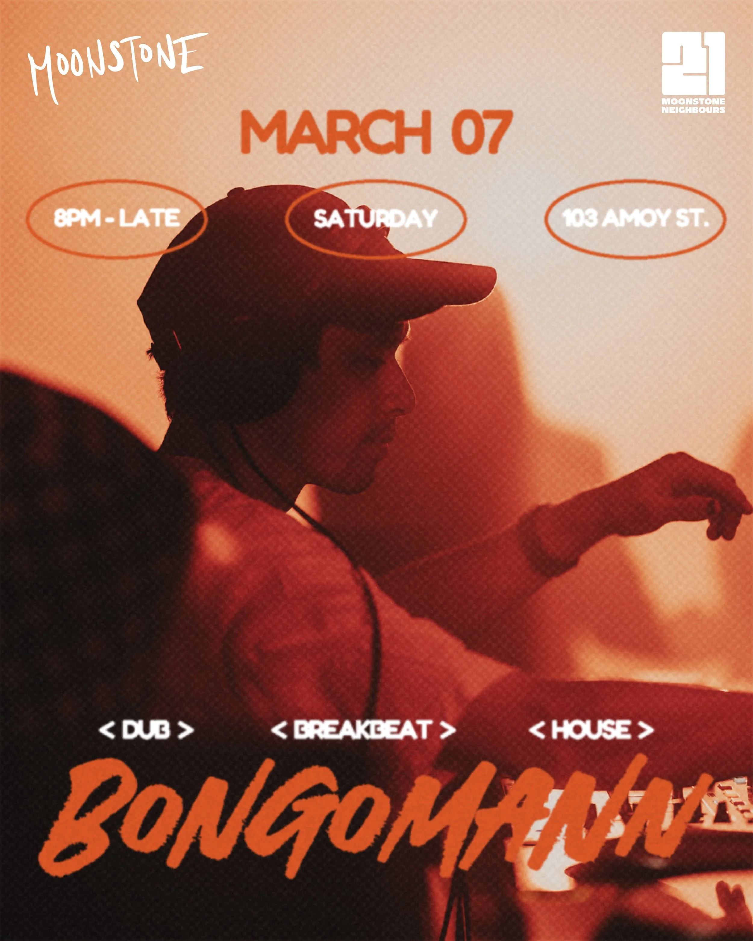 Bongomann — Singapore selector and producer repping Super Enjoy, Offtrack, Ice Cream Sundays and Sunda Festival — slides into Moonstone with a genre-fluid set built for the night: dreamy ambients, heady chuggers, soulful movers and proper dancefloor workouts. No rules, just good music and the kind of flow you lose track of time to.
